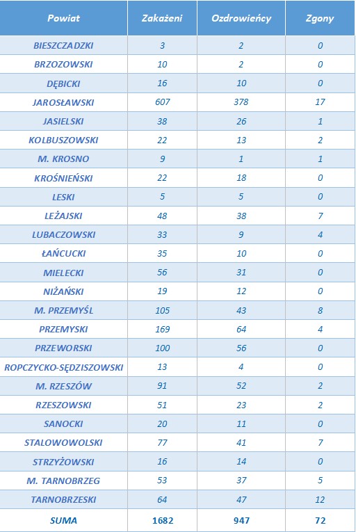 Na Podkarpaciu liczba osób zarażonych koronawirusem wzrosła do 1682, dotychczas zmarło 72 osoby.
