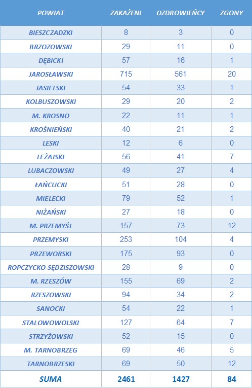 Liczba osób zarażonych koronawirusem na Podkarpaciu wzrosła do 2461. Dotychczas w naszym województwie sanepid odnotował 84 zgony.