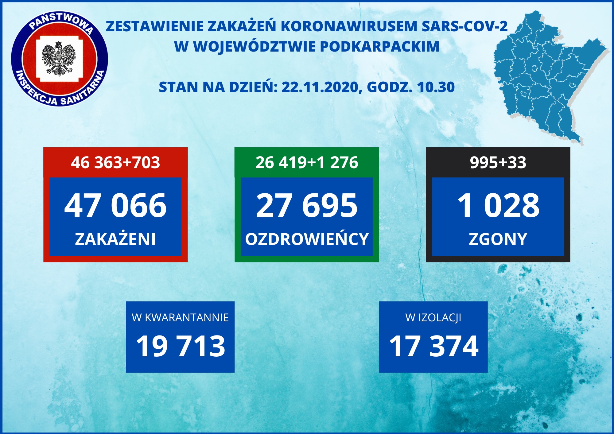 Obecnie na terenie województwa podkarpackiego kwarantanną objętych jest 19 713 osób, a w izolacji przebywa 17 374 osoby.