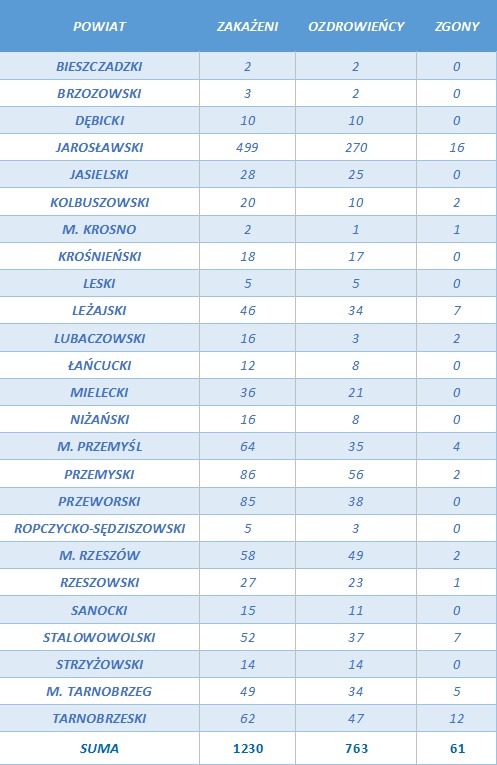 Liczba osób zarażonych koronawirusa na Podkarpaciu wzrosła do 1230. Sanepid w środę poinformował o kolejnych 15 osobach, które wyzdrowiały: 11 mieszkańców pow. jarosławskiego, 2 osoby z pow. łańcuckiego, po jednej z przeworskiego i Przemyśla. “Ozdrowieńców” w naszym województwie jest już 763.