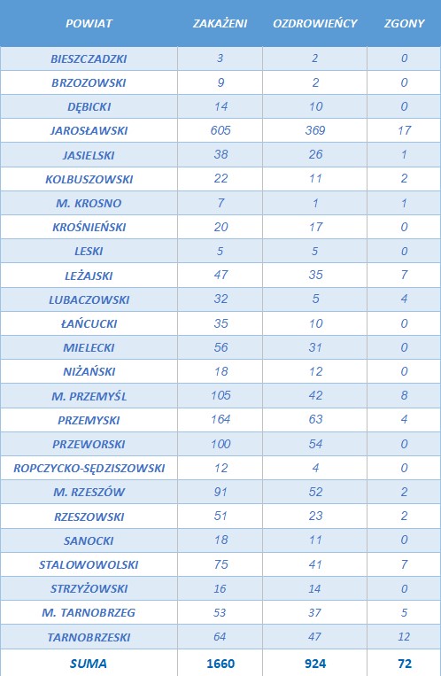 Ostatnich “ozdrowieńców” jest aż 34. To 16 mieszkańców powiatu jarosławskiego, po 4 mieszkańców powiatu mieleckiego i przeworskiego, 3 osoby z powiatu niżańskiego, po 2 osoby z miasta Rzeszowa i Przemyśla oraz po jednej osobie z powiatów łańcuckiego, ropczycko-sędziszowskiego i miasta Tarnobrzeg.