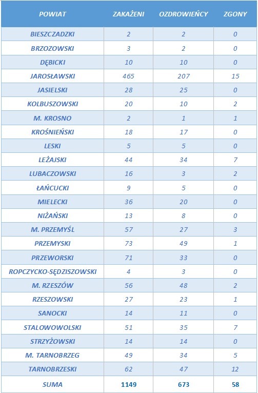 Na Podkarpaciu koronawirusa potwierdzono już laboratoryjnie u 1149 osób, z czego 673 wyzdrowiały. Sanepid odnotował 58 zgonów.