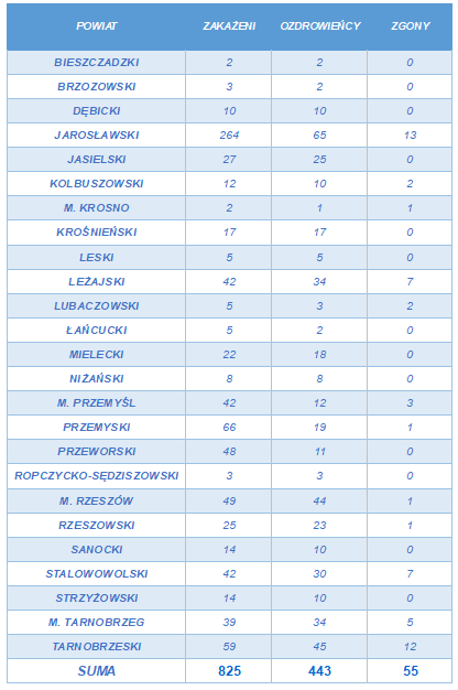 Tym sposobem liczba zakażonych koronawirusem na Podkarpaciu wzrosła do 825. Spośród nich 55 osób zmarło, a 443 osoby wyzdrowiały.