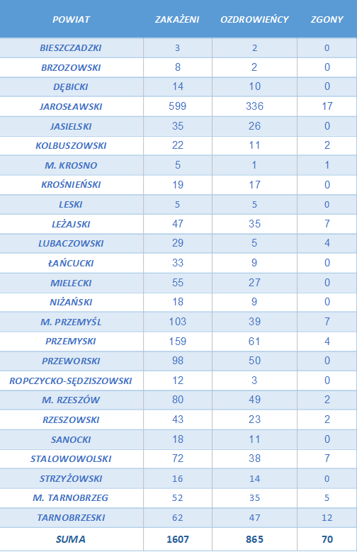 Liczba osób zarażonych koronawirusem na Podkarpaciu wzrosła do 1607. Sanepid poinformował także o kolejnych trzech osobach, które wyzdrowiały. To mieszkańcy powiatów jarosławskiego, przeworskiego i Przemyśla.