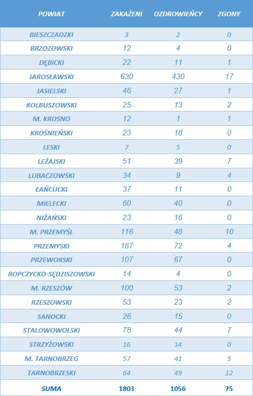 Sanepid w sobotę poinformował, że wyzdrowiało kolejne 55 osób: 30 mieszkańców powiatu jarosławskiego, po 4 osoby z powiatów: mieleckiego, przeworskiego, sanockiego, przemyskiego i Przemyśla; 2 osoby z powiatu brzozowskiego oraz po jednej osobie z powiatów leżajskiego, niżańskiego i jasielskiego. “Ozdrowieńców” jest już 1056.