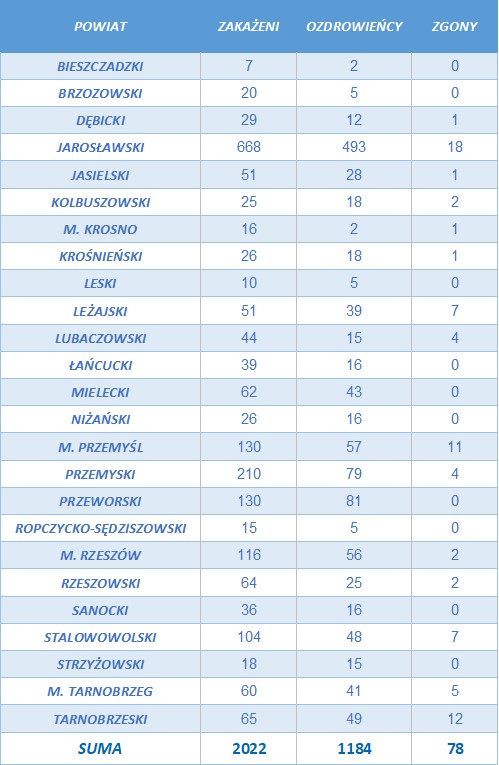 W piątek resort podał, że najwięcej zakażeń zanotowano na Śląsku (168), w Małopolsce (156) i na Mazowszu (146). Jest także 13 kolejnych przypadków śmiertelnych. Jeden z nich na Podkarpaciu. W czwartek w szpitalu w Łańcucie zmarł 85-letni mieszkaniec powiatu krośnieńskiego. Mężczyzna jest 78. ofiarą śmiertelną koronawirusa na Podkarpaciu.