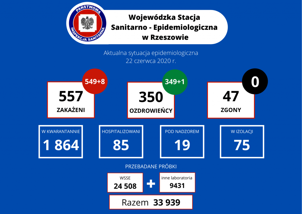 W naszym województwie przeprowadzono do tej pory 33 939 testów. Badaniami laboratoryjnymi potwierdzono 557 przypadków zakażenia koronawirusem SARS-CoV-2, z czego 350 osób wyzdrowiało, a 47 zmarło.