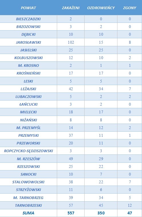 Zakażenia na Podkarpaciu potwierdzono u 4 osób z powiatu jarosławskiego (młodego mężczyzny, młodej i starszej kobiety oraz u dziecka), u 2 osób z powiatu sanockiego (kobieta i mężczyzna w sile wieku), a także u mężczyzny w sile wieku z powiatu stalowowolskiego i –podobnie – mężczyzny w sile wieku z powiatu przeworskiego. Wszyscy zakażeni przebywają w izolacji.