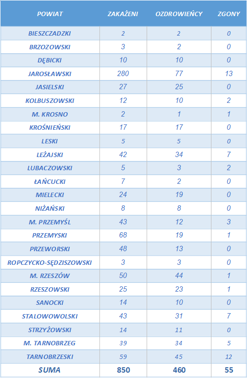 Sanepid poinformował także o kolejnych 11 osobach, które wyzdrowiały: 8 mieszkańców powiatu jarosławskiego, dwóch z powiatu przeworskiego i mieszkaniec powiatu strzyżowskiego. Wszystkich “ozdrowieńców” na Podkarpaciu jest już 460.