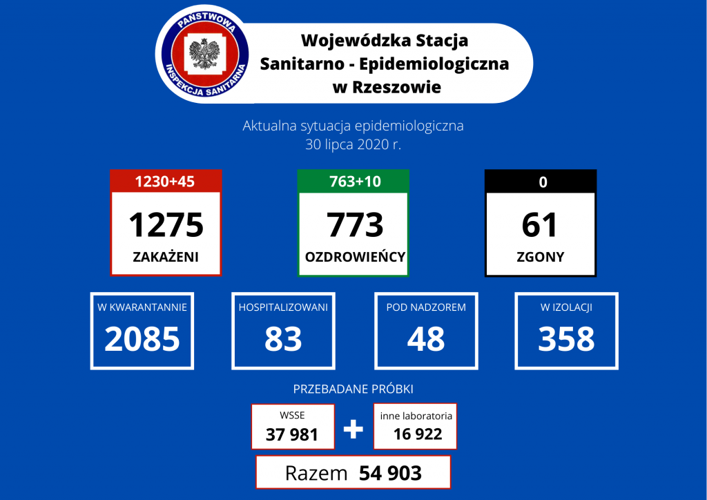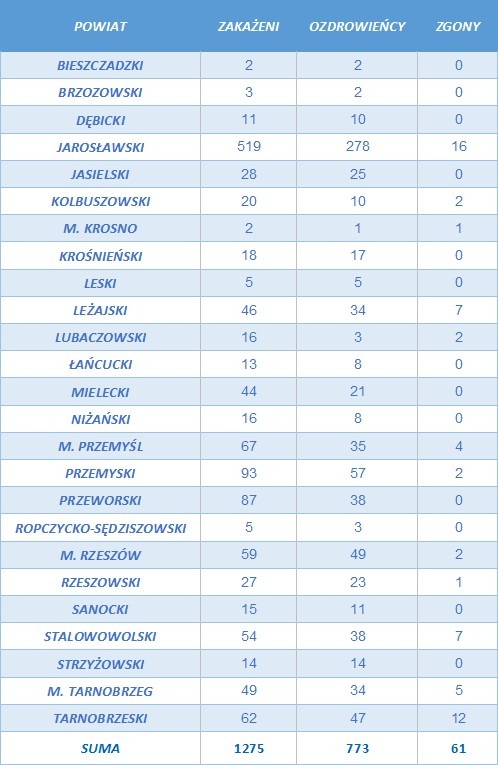 Tym sposobem liczba zakażonych koronawirusem w województwie podkarpackim wzrosła do 1275. Jednocześnie 773 osób w naszym regionie wyzdrowiało, a 61 zmarło.