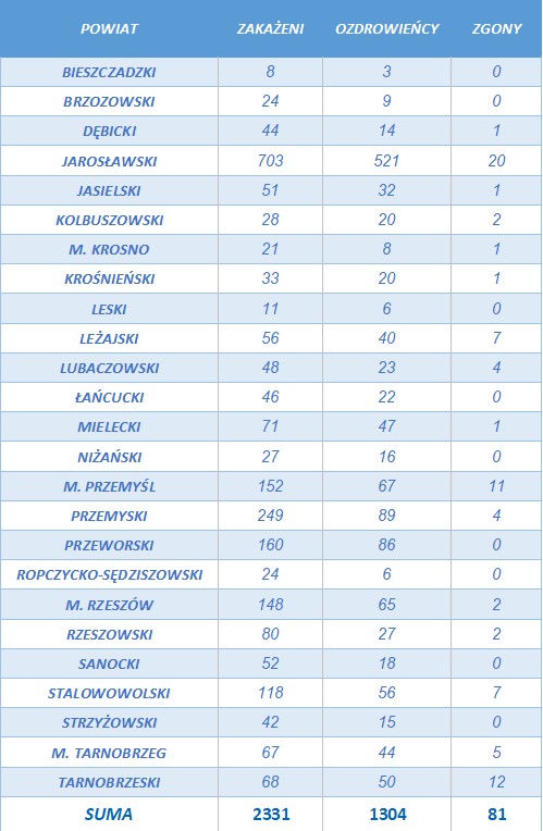 Liczba osób zarażonych koronawirusem na Podkarpaciu wzrosła do 2331. Dotychczas odnotowano w naszym województwie 81 zgonów.