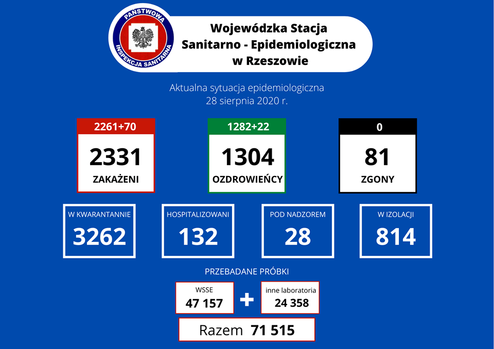 Obecnie na Podkarpaciu pod nadzorem pozostaje 28 osób, 3262 poddane jest kwarantannie, a w izolacji przebywa 814 osób. Aktualnie z potwierdzonym COVID-19 w szpitalach jest 132 osoby.