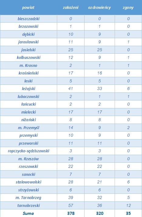 Na Podkarpaciu liczba osób, które zachorowały na COVID-19, wynosi 378, z czego 320 osób wyzdrowiało, z powodu koronawirusa odnotowano 35 zgonów. W tej chwili pod nadzorem sanepidu jest 16 osób, 2077 przechodzi kwarantannę, 6 osób jest w izolacji domowej.