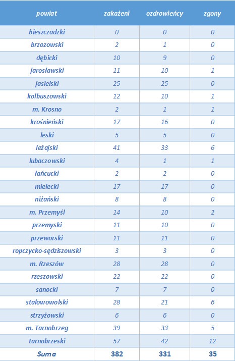 Dotychczas koronawirusa potwierdzono u 382 osób, z czego 331 już wyzdrowiało, sanepid odnotował też 35 przypadków śmiertelnych. Obecnie na Podkarpaciu pod nadzorem pozostaje 31 osób, 1636 przechodzi kwarantannę, w izolacji domowej przebywają 4 osoby.