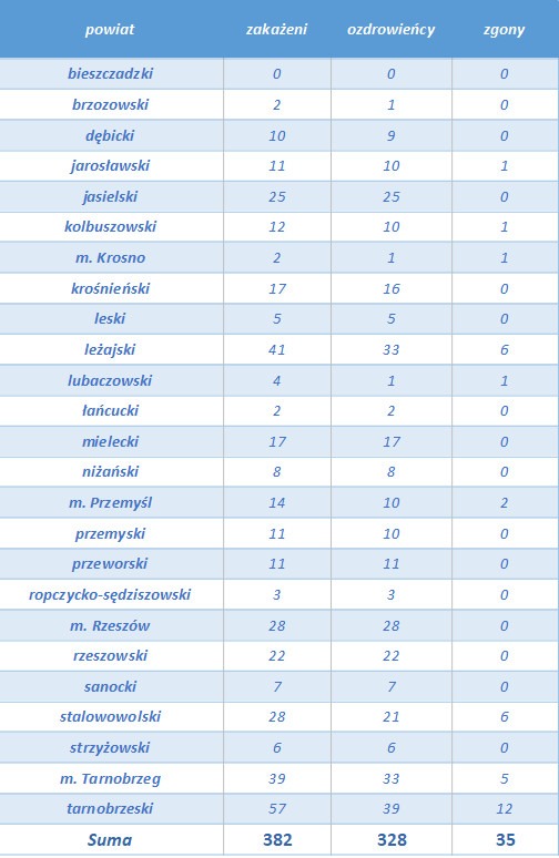 Na Podkarpaciu koronawirusa potwierdzono dotychczas u 382 osób. Po godz. 17:30 Wojewódzka Stacja Sanitarno-Epidemiologiczna w Rzeszowie podała, że kolejną osobą, która wyzdrowiała, jest kobieta z powiatu kolbuszowskiego. Wszystkich “ozdrowieńców” jest już 328. Na Podkarpaciu sanepid stwierdził 35 zgonów.