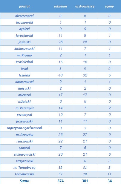 Dotychczas na Podkarpaciu koronawirusa potwierdzono u 374 osób, wyzdrowiało 301, odnotowano 34 zgony. W poniedziałek Wojewódzka Stacja Sanitarno-Epidemiologiczna w Rzeszowie poinformowała, że 9 kolejnych osób wyzdrowiało: 3 z powiatu przemyskiego, 3 z Tarnobrzega, 2 z powiatu kolbuszowskiego i 1 z powiatu tarnobrzeskiego.