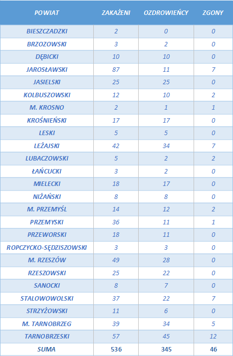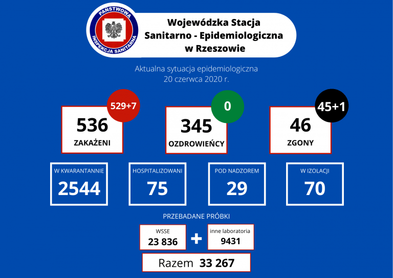 Liczba osób na Podkarpaciu, którzy zachorowali na COVID-19 wzrosła do 536, dotychczas wyzdrowiało 345 osób. Do tej pory w naszym województwie przeprowadzono 33 267 testów. Pod nadzorem jest 29 osób, kwarantannę przechodzi 2544, w izolacji domowej przebywa 70 osób.