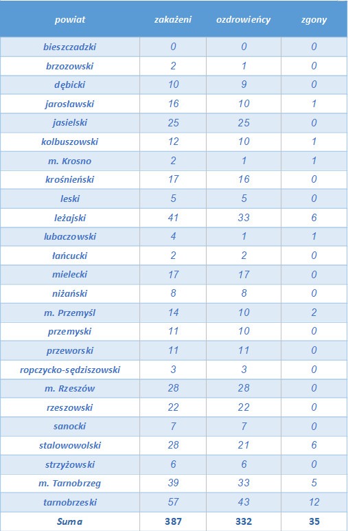 Na Podkarpaciu dotychczas odnotowano 387 przypadków koronawirusa, z czego 332 osób już wyzdrowiało, sanepid w swoich statystykach podaje, że z powodu COVID-19 w naszym województwie zmarło 35 osób.