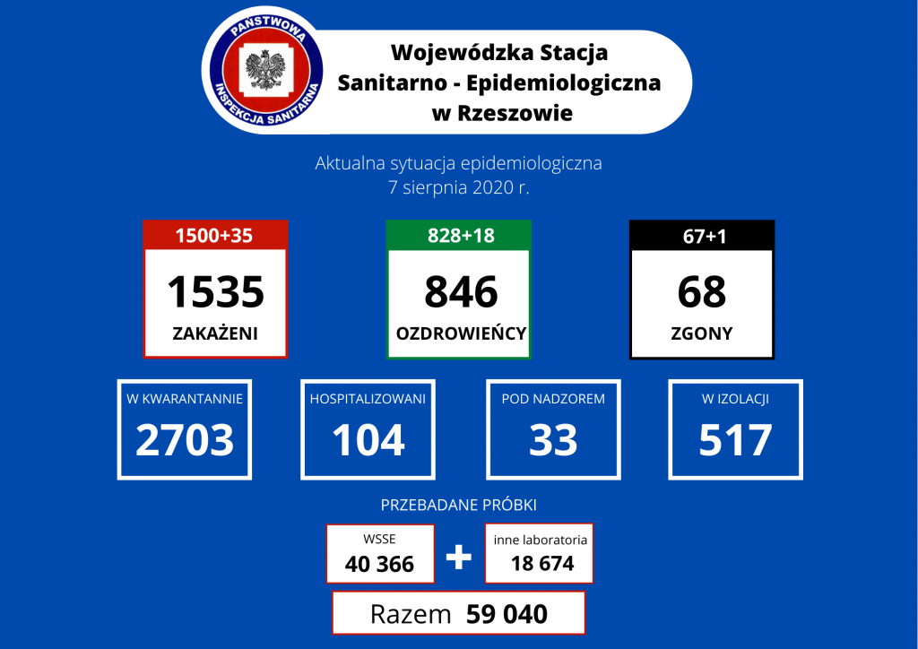 Do tej pory na Podkarpaciu przeprowadzono 59 040 testów na obecność koronawirusa. Pod nadzorem sanepidu pozostaje 33 osoby, na kawarantannie jest 2703, a w izolacji przebywa 517. Aktualnie z potwierdzonym COVID-19 w szpitalach znajduje się 104 osoby.