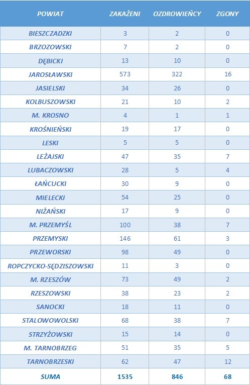 Liczba osób zarażonych koronawirusem na Podkarpaciu wzrosła do 1535. 68 z zakażonych zmarło, a 846 wyzdrowiało.