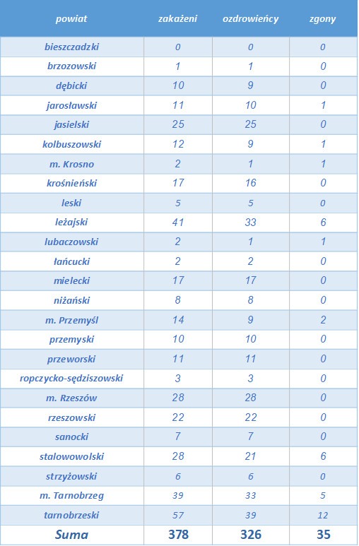 Według danych WSSE w Rzeszowie, na Podkarpaciu koronawirusa potwierdzono już u 378 osób, 326 wyzdrowiało, sanepid odnotował 35 zgonów. Obecnie w naszym województwie pod nadzorem pozostaje 31 osób, 1954 przechodzi kwarantanne, w izolacji domowej przebywają 4 osoby. Z potwierdzonym COVID-19 hospitalizowanych jest 13 osób.