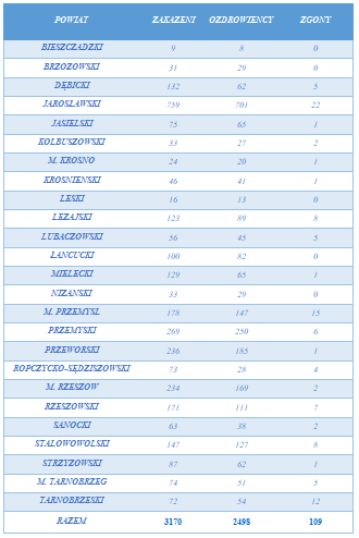 W sobotę sanepid poinformował też, że w województwie podkarpackim wyzdrowiało kolejne 42 osoby. To mieszkańcy 8 powiatów. “Ozdrowieńców” jest już 2498.