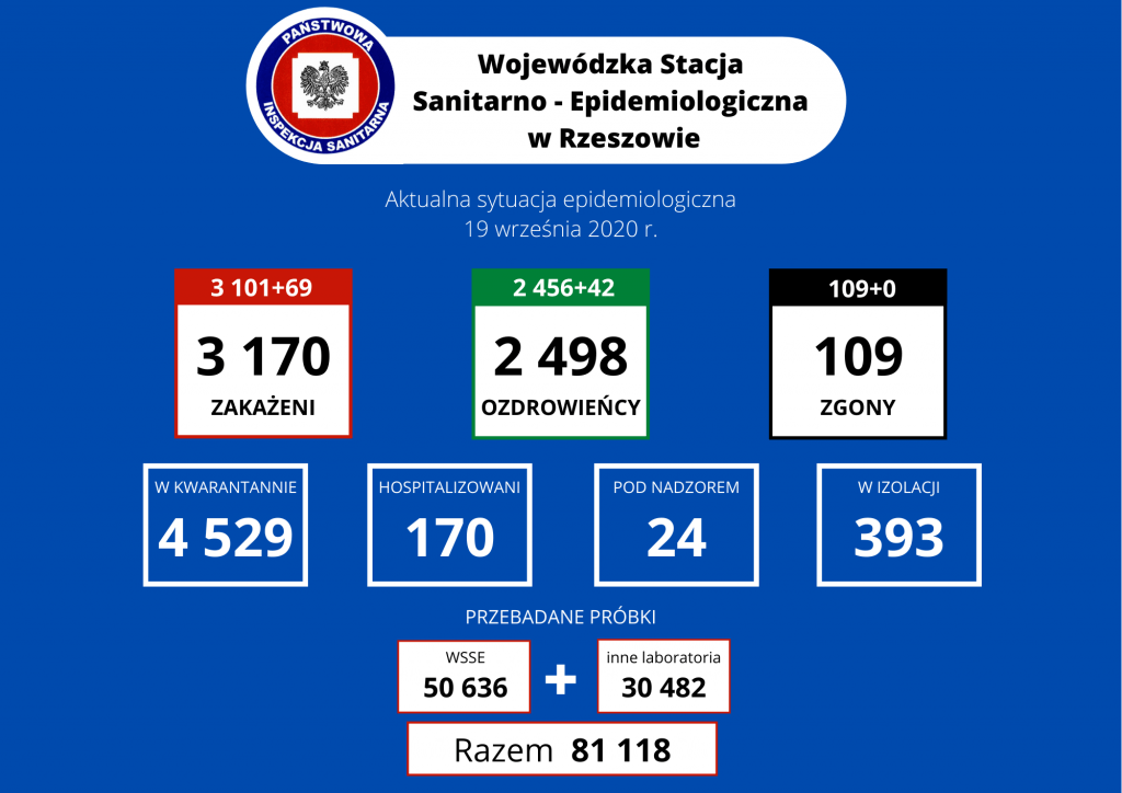 Liczba osób zakażonych koronawirusem na Podkarpaciu wzrosła w ten sposób do 3170. Aktualnie w naszym regionie pod nadzorem sanepidu pozostaje 24 osoby, 4 529 przebywa na kwarantannie, a w izolacji znajduje się 393 osób. Z potwierdzonym COVID-19 hospitalizowanych jest z kolei 170 osób.
