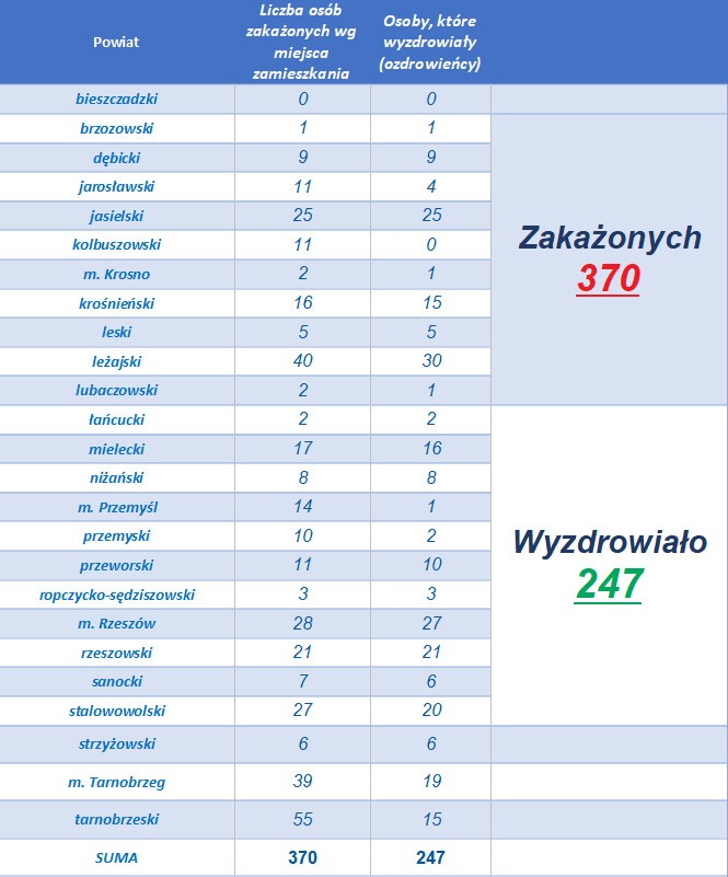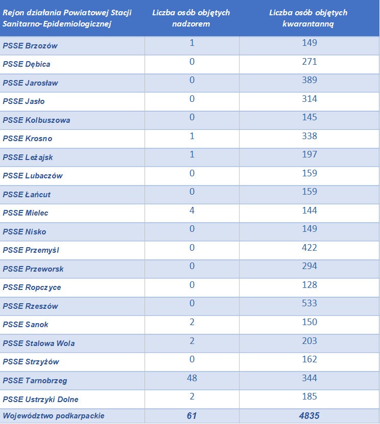 Obecnie na Podkarpaciu pod nadzorem sanepidu jest 61 osób, 4835 przechodzi kwarantannę, 33 osoby są w izolacji domowej. Aktualnie z potwierdzonym COVID-19 hospitalizowanych jest 62 osoby. W całym kraju koronawirusa potwierdzono dotychczas u 15 366 osób, według ministerialnych statystyk zmarło 776.