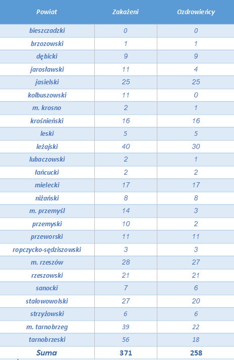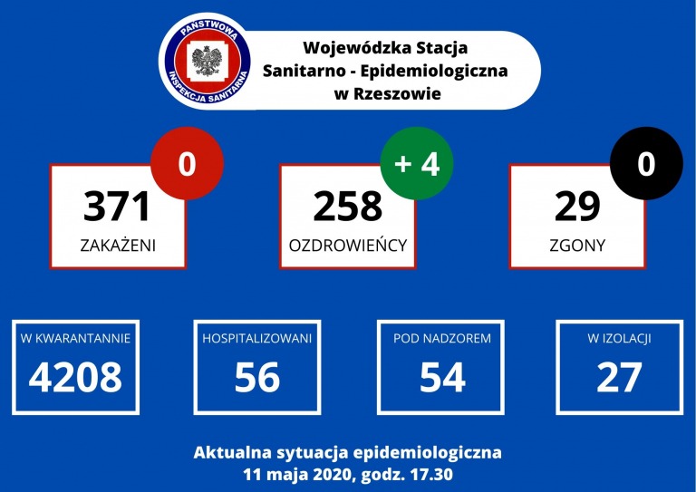 Obecnie na terenie województwa podkarpackiego pod nadzorem pozostaje 54 osoby, 4208 poddane jest kwarantannie, a w izolacji domowej przebywa 27 osób. Na Podkarpaciu wyzdrowiało 258 osób spośród 371 dotychczas zarażonych. Sanepid odnotował do tej pory. Aktualnie z COVID-19 na Podkarpaciu hospitalizowanych jest 56 osób.