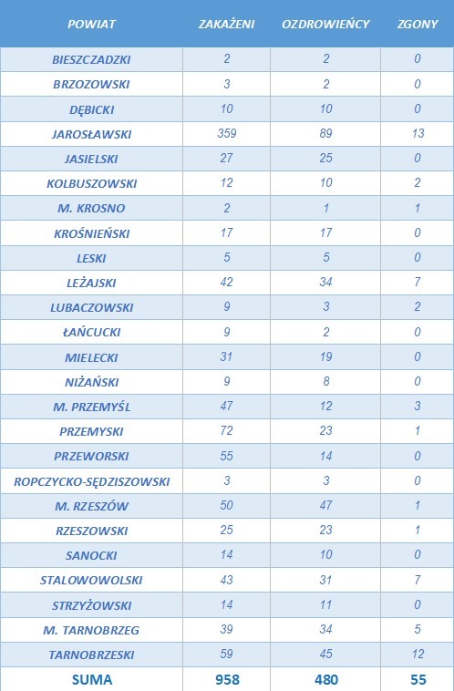 Liczba zakażonych koronawirusem na Podkarpaciu wzrosła do 958. Spośród nich 55 osób zmarło, a 480 wyzdrowiało.