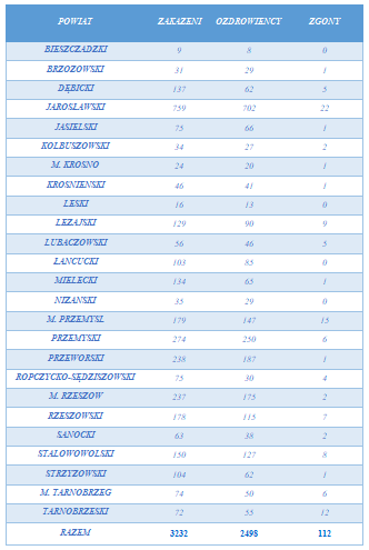 Liczba zakażonych koronawirusem na Podkarpaciu wzrosła do 3232. W naszym regionie pod nadzorem sanepidu jest 18 osób. Na kwarantannie przebywa ich 4 666, a w izolacji – 417. Z potwierdzonym COVID-19 hospitalizowane są aktualnie 184 osoby.