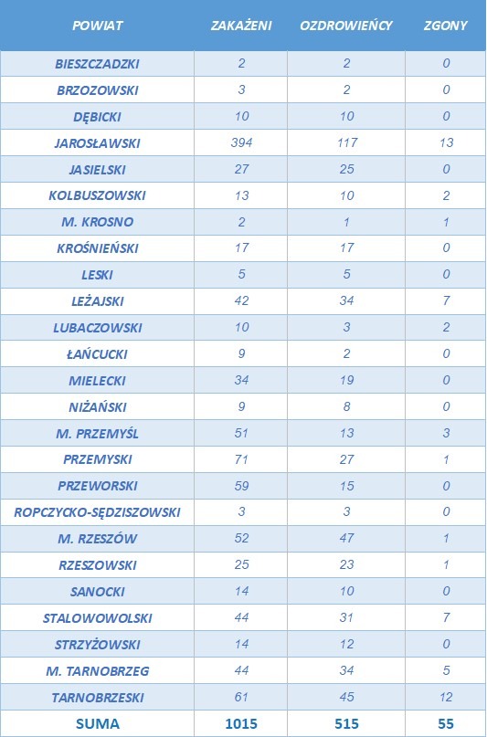 Liczba zakażonych koronawirusem na Podkarpaciu wzrosła w czwartek do 1015. Ponad połowa zakażonych osób wyzdrowiała, a 55 z nich zmarło.