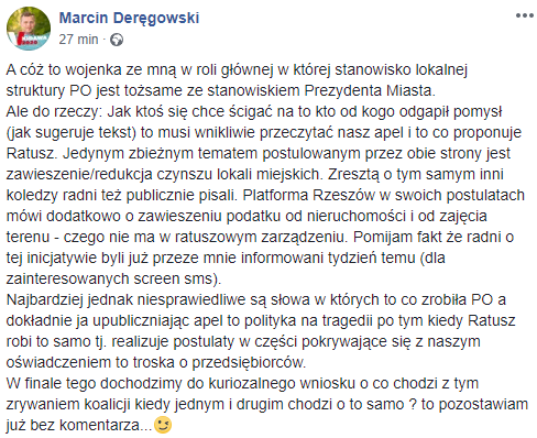 Rzeszowska PO chce dodatkowo zawieszenia podatku od nieruchomości i opłat za zajęcie miejskiego terenu. Marcin Deręgowski twierdzi, że o tej inicjatywie radnych informował już tydzień temu. W rozmowie z Rzeszów News mówi, że najbardziej boli go to, że pod jego adresem padają słowa, że na tragedii przedsiębiorców buduje swój kapitał polityczny.