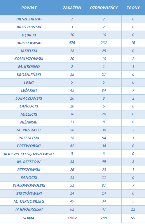 Na Podkarpaciu koronawirusa odnotowano już u 1182 osób. Sanepid podał również, że w naszym województwie wyzdrowiały kolejne 24 osoby: 17 mieszkańców powiatu jarosławskiego, 3 z pow. przemyskiego, 2 z Przemyśla oraz po jednej osobie z powiatów: stalowowolskiego i przeworskiego. “Ozdrowieńców” jest już 711.
