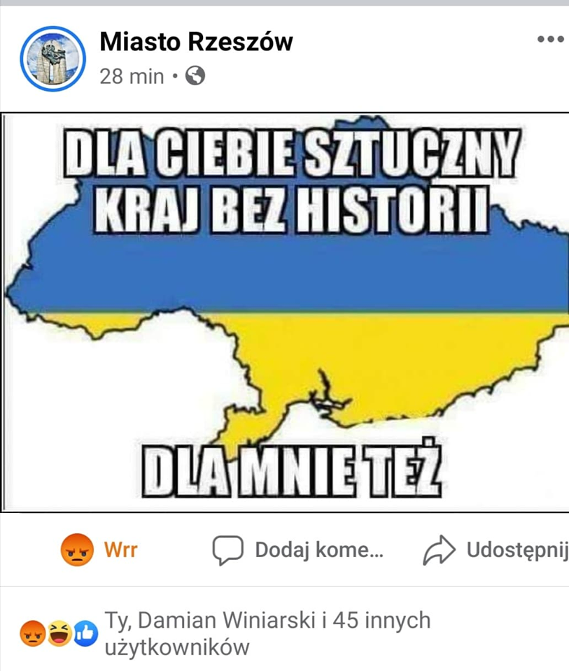 Teraz znów się o nich zrobiło głośno za sprawą dwóch kolejnych postów. Gdy w zeszły czwartek, 12 marca, w całym kraju zamknięto uczelnie, szkoły i przedszkola w obawie przed koronawirusem, “Miasto Rzeszów” tego samego dnia zamieściło ksenofobiczną grafikę z mapą Ukrainy i napisem: “Dla ciebie sztuczny kraj bez historii. Dla mnie też”.