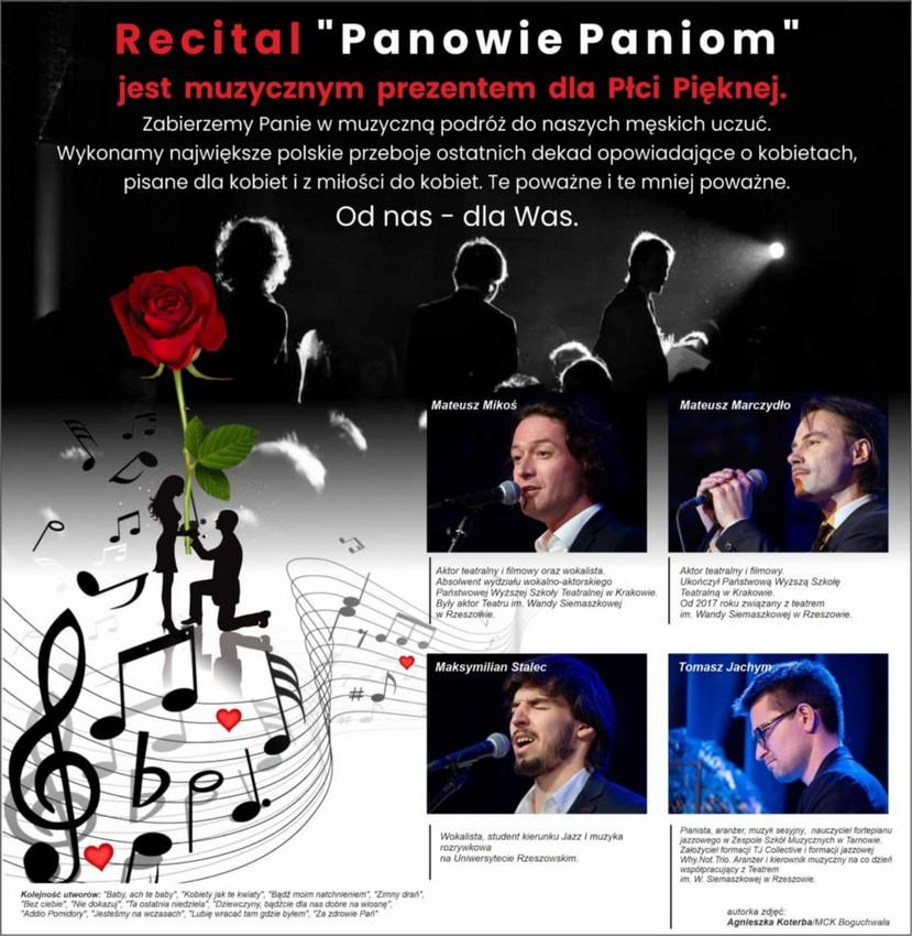 Z okazji Dnia Kobiet rzeszowscy artyści przygotowali koncert, który przeniesie publiczność w muzyczną podróż do świata męskich uczuć. W repertuarze znajdą się największe polskie przeboje ostatnich dekad – zarówno poważne, jak i te bardziej lekkie, pisane z miłości do kobiet.