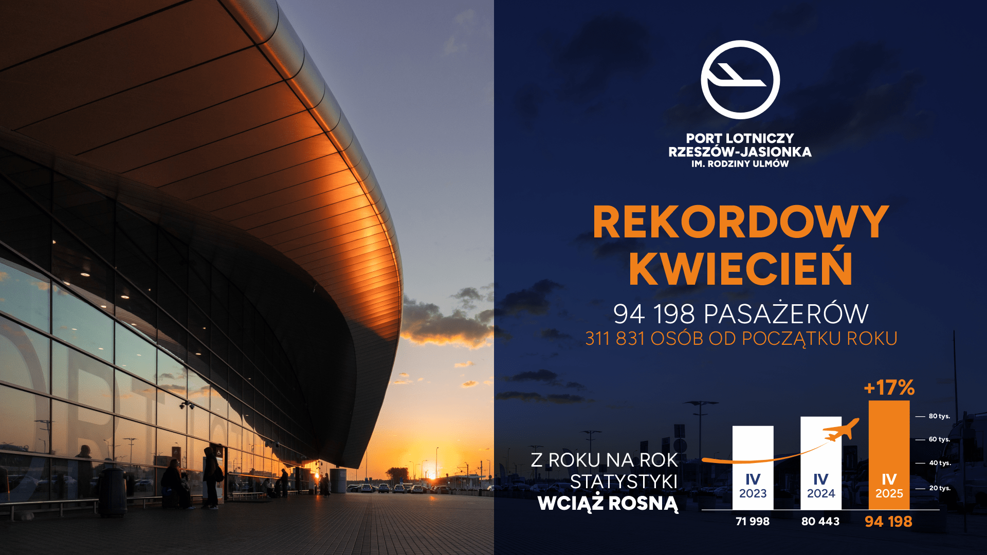 Lotnisko Rzeszów-Jasionka im. Rodziny Ulmów zanotowało najlepszy miesiąc w swojej historii. W kwietniu 2025 r. podkarpacki port lotniczy obsłużył 94 198 pasażerów, czyli o 17 proc. więcej niż rok wcześniej. Od stycznia lotnisko odprawiło już ponad 300 tysięcy podróżnych.