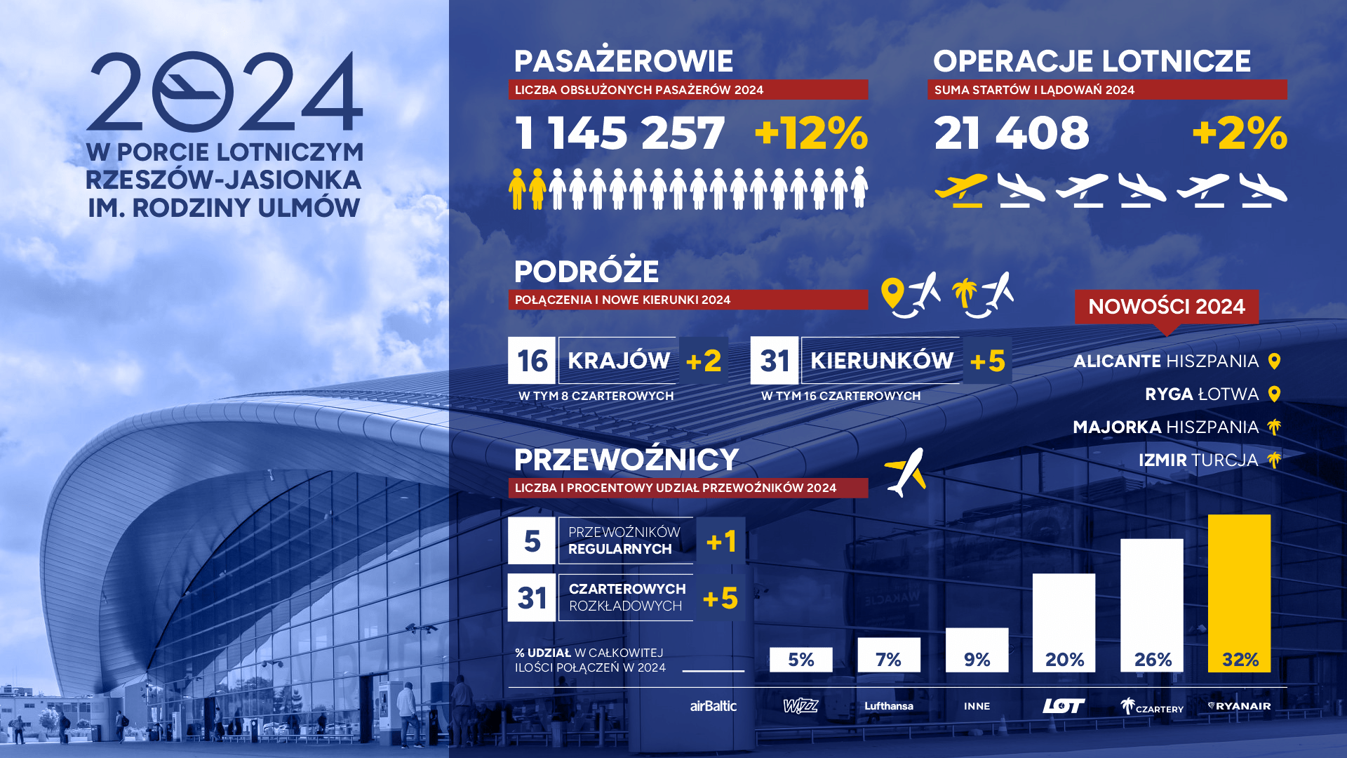 Dodatkowo, o 33 procent wzrosła liczba pasażerów, korzystających z czarterów (16 kierunków do 8 krajów). W 2024 roku wyniosła 302 tys. osób.