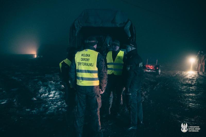 Na zdjęciach wykonanych wczorajszego wieczora i dziś rano widać skalę wyzwania: gęste mleko spowijające las, błoto i światła latarek przebijające mrok. W tych warunkach, ramięwraz ze strażakami i policją, pracowali żołnierze 3 Podkarpackiej Brygady Obrony Terytorialnej (3 PBOT).