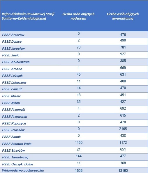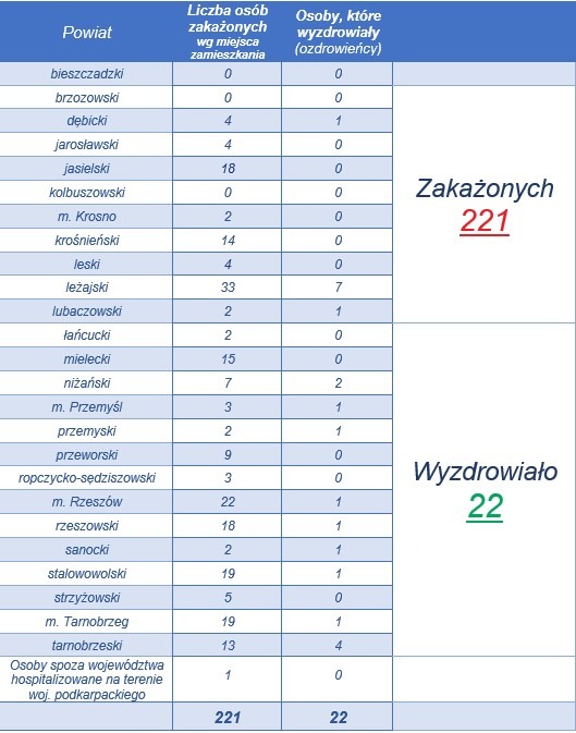 Na Podkarpaciu koronawirusem zaraziło już 221 osób, z czego 12 zmarło, 22 osoby wyzdrowiały. Pod nadzorem jest 1536 osób, 13 163 poddano kwarantannie. Aktualnie hospitalizowanych jest 152 osoby z podejrzeniem koronawirusa.