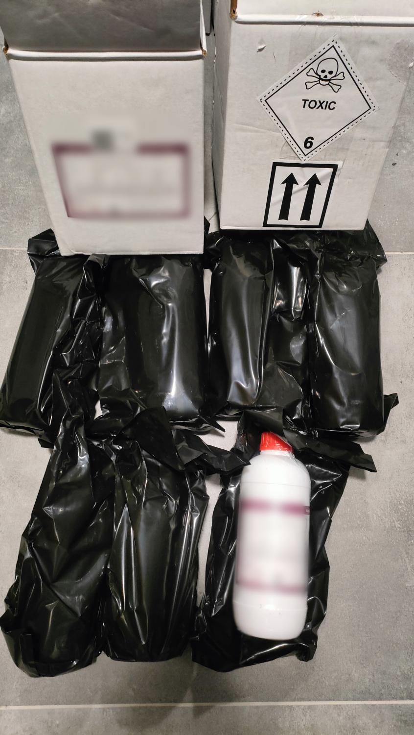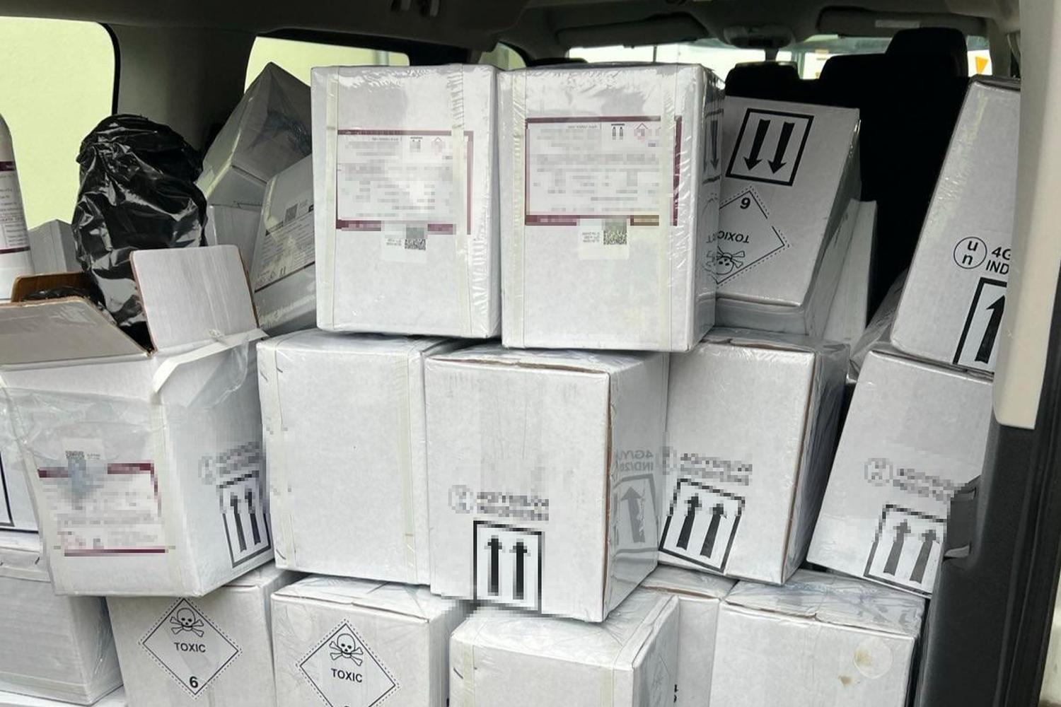 Sytuacja zmieniła się diametralnie po otwarciu bagażnika. Mundurowi natrafili na dużą ilość płynu w pojemnikach oznaczonych etykietami sugerującymi bardzo wysoką zawartość nikotyny. Łącznie było to aż 320 litrów substancji, która natychmiast wzbudziła podejrzenia funkcjonariuszy.
