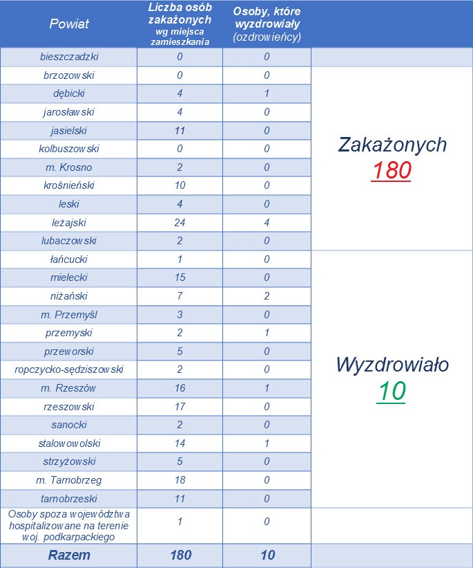 Do 180 wzrosła liczba osób zarażonych koronawirusem na Podkarpaciu – poinformowała w środę wieczorem Wojewódzka Stacja Sanitarno-Epidemiologiczna w Rzeszowie.