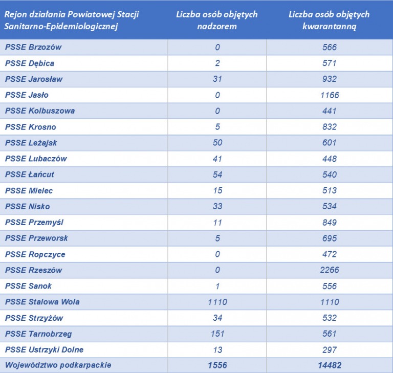 Obecnie na Podkarpaciu pod nadzorem epidemiologicznym jest 1556 osób, a 14 482 poddano kwarantannie. Aktualnie hospitalizowanych jest 146 osób, u których podejrzewa się koronawirusa W podkarpackim sanepidzie wykonano dotychczas 3703 testy.