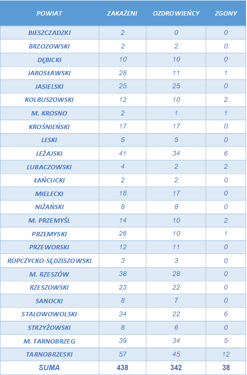 Dotychczas na Podkarpaciu badania laboratoryjne potwierdziły koronawirusa u 438 osób, 342 wyzdrowiały, 38 osób zmarło.