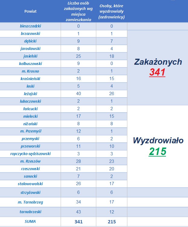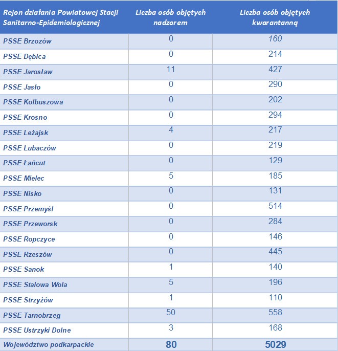 Badania laboratoryjne przeprowadzone do tej pory na Podkarpaciu potwierdziły koronawirusa u 341 osób, 215 wyzdrowiało, odnotowano 23 zgony. Aktualnie z potwierdzonym COVID-19 na Podkarpaciu hospitalizowanych jest 78 osób, pod nadzorem pozostaje 80 osób, 5029 poddano kwarantannie, a w izolacji domowej jest 27 osób.