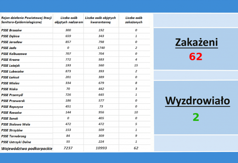 Na Podkarpaciu potwierdzono koronawirusa już u 62 osób, dwie z nich wyzdrowiały. Obecnie na Podkarpaciu pod nadzorem epidemiologicznym pozostaje 7756 osób, 10 709 poddano kwarantannie. W szpitalach jest 95 osób, u których podejrzewa się koronawirusa.