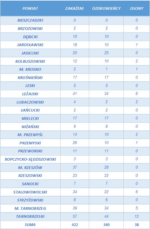 Liczba osób zarażonych koronawirusem na Podkarpaciu wzrosła do 422. Podkarpacki sanepid poinformował o kolejnym wyzdrowieniu – kobiety w „sile wieku” z powiatu lubaczowskiego. Łącznie wszystkich „ozdrowieńców” w naszym regionie jest już 340. Z powodu zachorowania na COVID-19 zmarło dotychczas 38 osób.