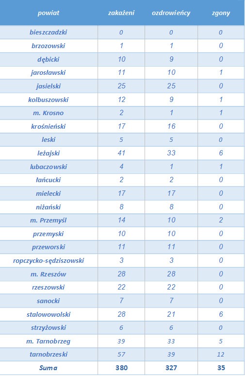 Dotychczas na Podkarpaciu badania laboratoryjne potwierdziły koronawirusa u 380 osób, 327 wyzdrowiało, sanepid odnotował 35 zgonów. Obecnie w naszym województwie pod nadzorem jest 31 osób, 1859 przechodzi kwarantannę, w izolacji domowej są 3 osoby.