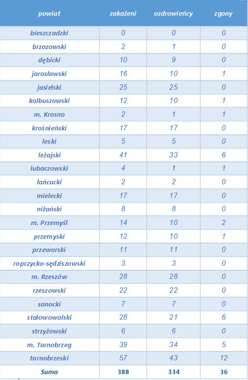 Wśród śmiertelnych ofiar jedna osoba jest z Podkarpacia. To 69-letni mężczyzna, który był pacjentem szpitala w Przemyślu. Mężczyzna, jak poinformował podkarpacki sanepid, zmarł we wtorek (2 czerwca). To 36. śmiertelna ofiara COVID-19 na Podkarpaciu.