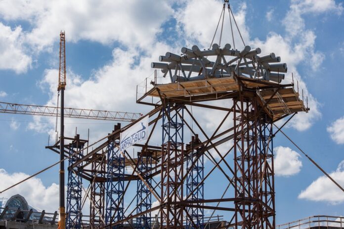 Zwornik został zamontowany przy użyciu 500-tonowego dźwigu, którego wysokość robocza sięga 86 m.